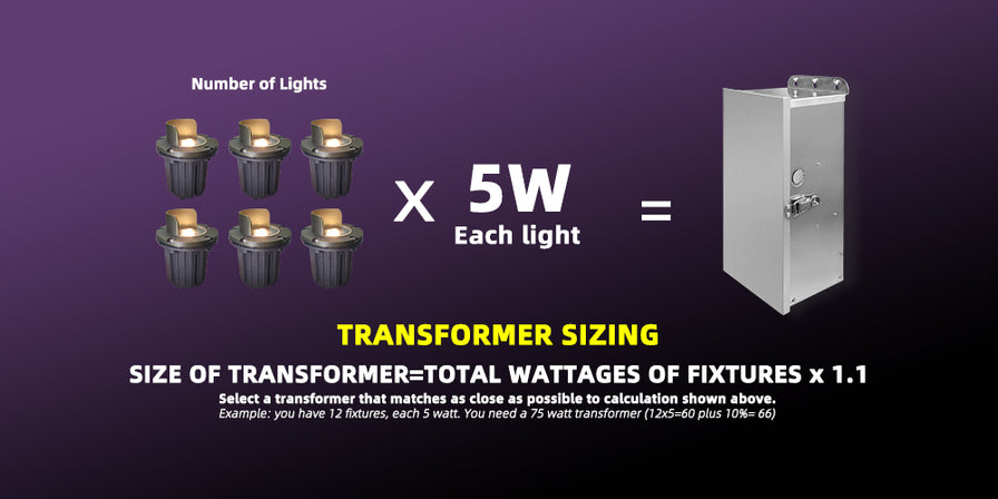 The total wattage of all fixtures connected to one transformer must not exceed the wattage capacity of the transformer.