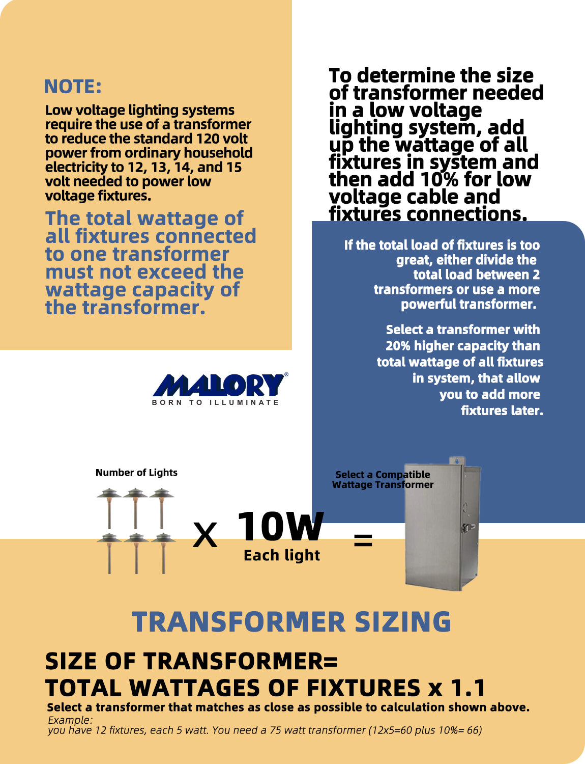 The total wattage of all fixtures connected to one transformer must not exceed the wattage capacity of the transformer.
