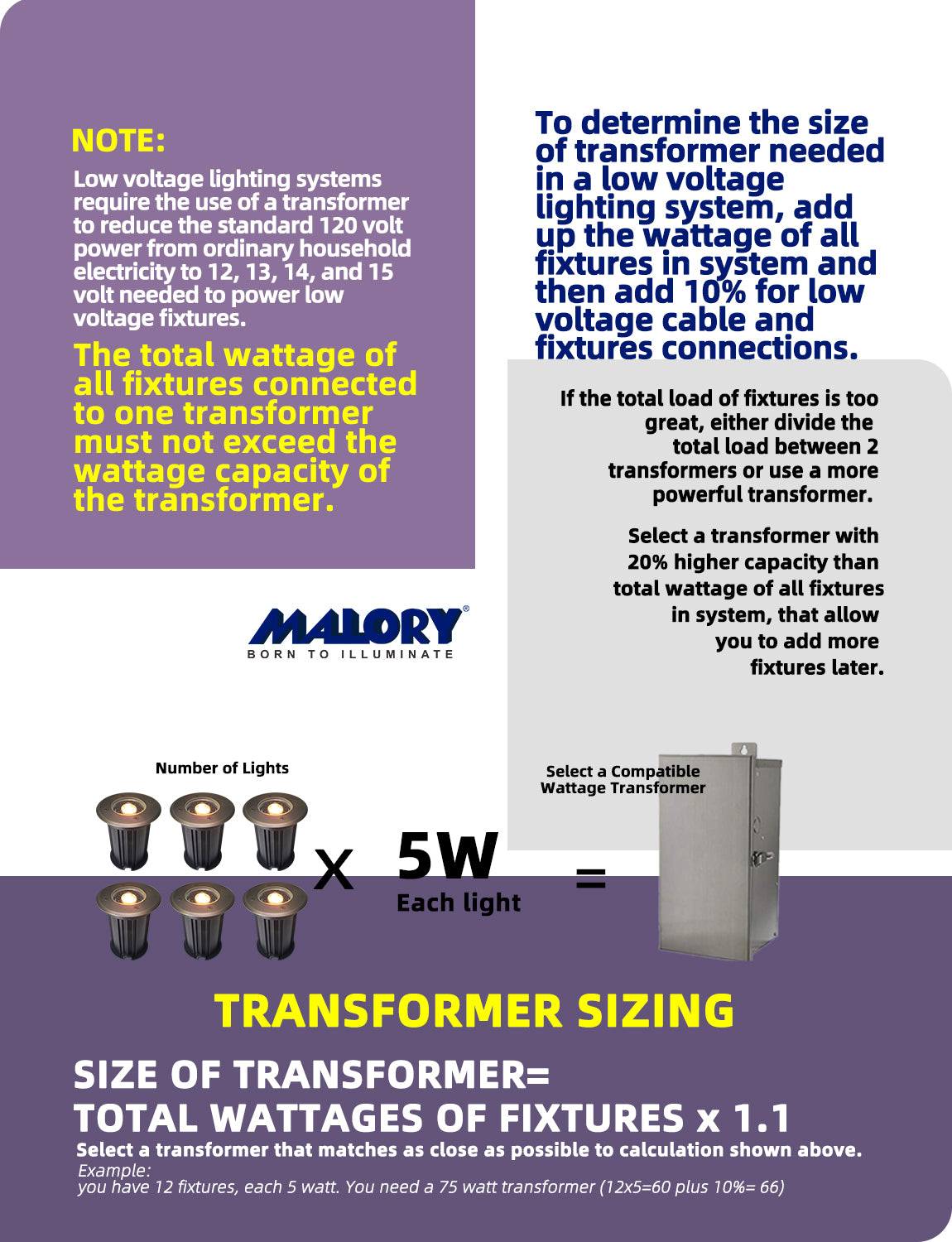 The total wattage of all fixtures connected to one transformer must not exceed the wattage capacity of the transformer.