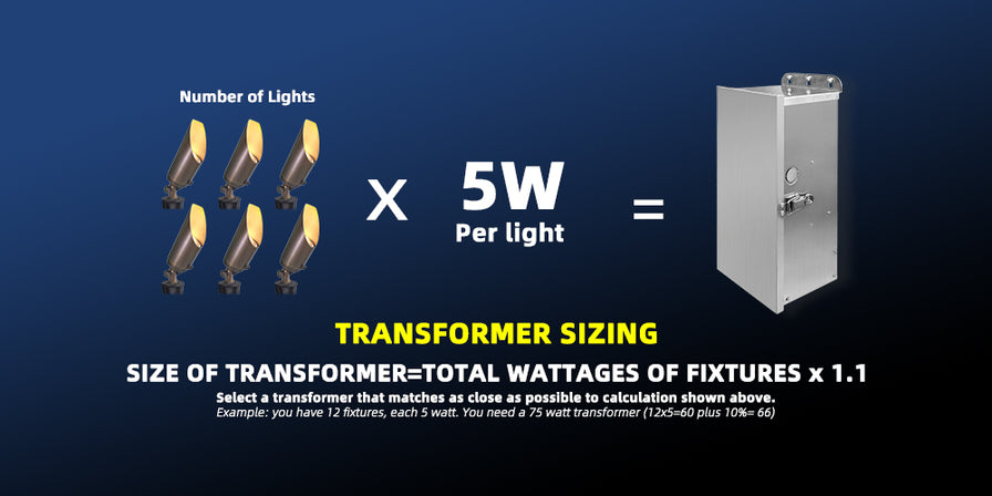 To determine the size of transformer needed in a low voltage lighting system, add up the wattage of all fixtures in system and then add 10% for low voltage cable and fixtures connections.